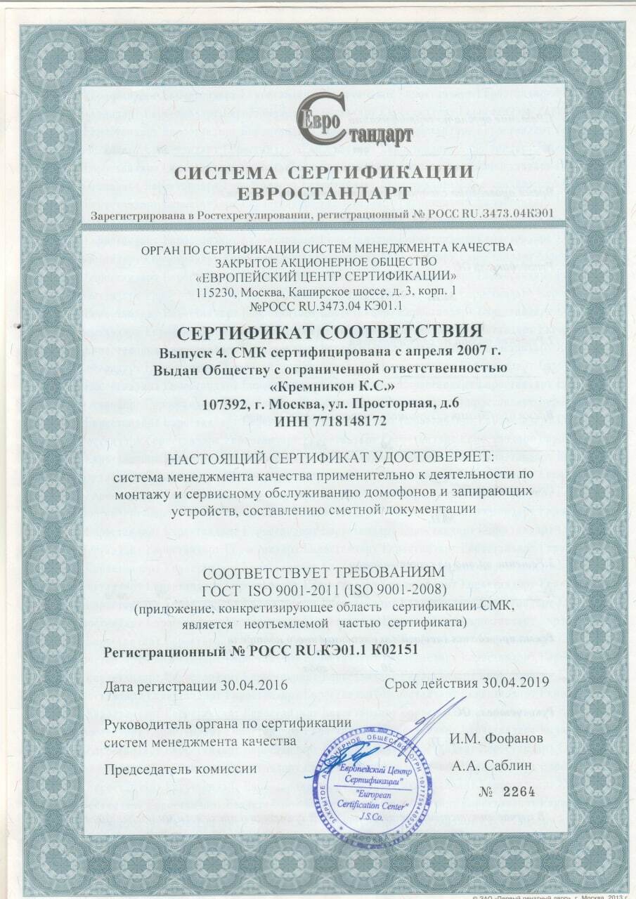 Качество работы наших специалистов подтверждено сертификатами соответствия, выданными «Европейским центром сертификации «Евростандарт» и региональной системой сертификации жилищно-коммунальных услуг в г. Москве.